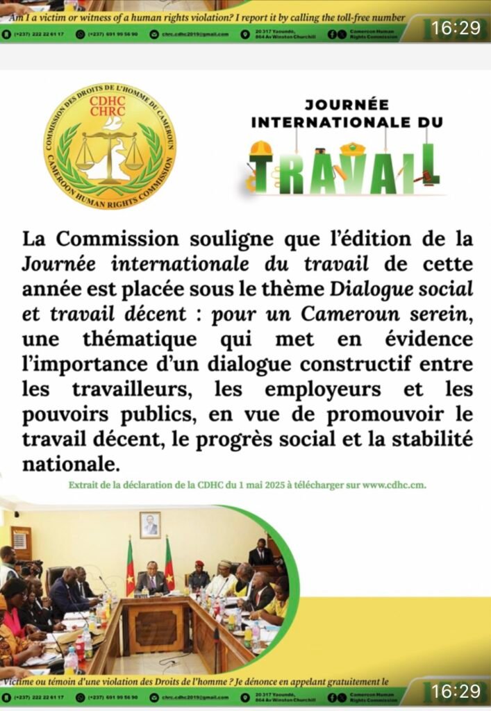 La Commission souligne que l’édition de la Journée internationale du travail de cette année est placée sous le thème Dialogue social et travail décent : pour un Cameroun serein, une thématique qui met en évidence l’importance d’un dialogue constructif entre les travailleurs, les employeurs et les pouvoirs publics, en vue de promouvoir le travail décent, le progrès social et la stabilité nationale.