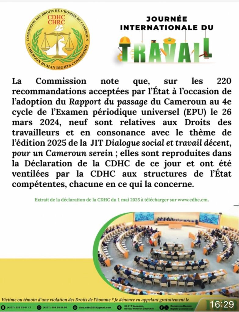 La Commission note que, sur les 220 recommandations acceptées par l’État à l’occasion de l’adoption du Rapport du passage du Cameroun au 4e cycle de l’Examen périodique universel (EPU) le 26 mars 2024, neuf sont relatives aux Droits des travailleurs et en consonance avec le thème de l’édition 2025 de la JIT Dialogue social et travail décent, pour un Cameroun serein ; elles sont reproduites dans la Déclaration de la CDHC de ce jour et ont été ventilées par la CDHC aux structures de l’État compétentes, chacune en ce qui la concerne.