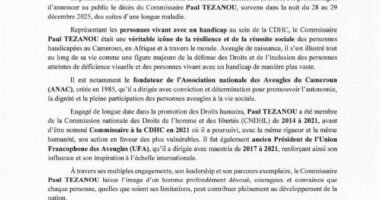 Société Nécrologie-Paul TEZANOU n’est plus : la CDHC adresse ses sincères condoléances à la famille éprouvée C’est à l’issue d’un communiqué rendu public le 29 décembre 2025 par… Suzane30/12/2025