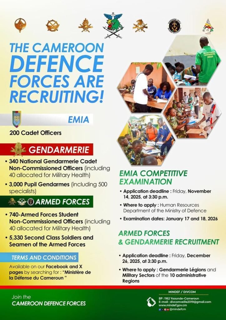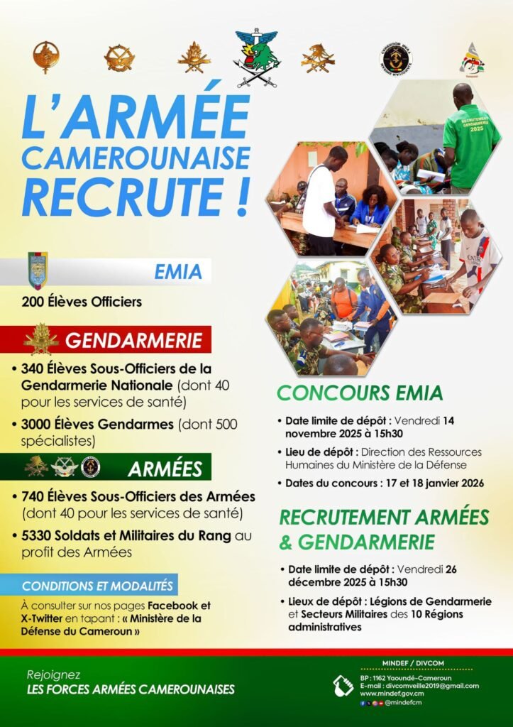 Pour ce qui des conditions d’éligibilité et les modalités,bien vouloir consulter les pages Facebook et X-Twitter en tapant << Ministère de la Défense du Cameroun>>.