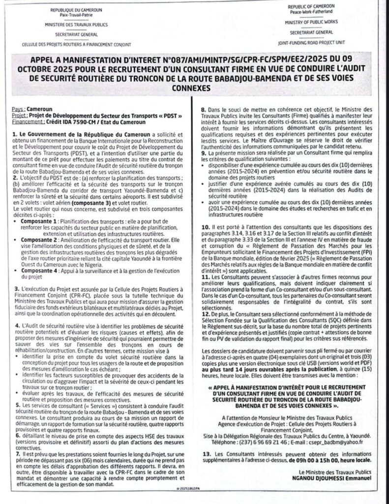 Dans le souci de renforcer la sécurité et la performance du réseau routier national, le Ministère des Travaux Publics lance un appel à manifestation d’intérêt pour le recrutement d’un consultant chargé de conduire l’audit sécuritaire de la route Babadjou–Bamenda et de ses voies connexes.