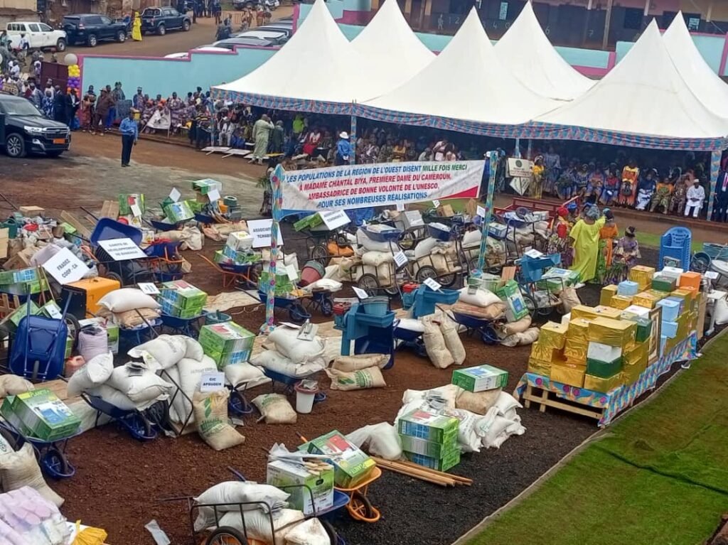 Lors de son mot pour la circonstance, Célestine Ketcha Courtes, a présenté en rappel les actions effectuées par le Cerac qui sillonne le Cameroun pour poser de nombreuses actions citoyennes dans les domaines de l’éducation, la santé, l’hydraulique, de la promotion de la femme et la jeune fille, la lutte contre la pauvreté, les pandémies, etc. Aussi elle a précisé que grâce à la Première Dame camerounaise madame Chantal Biya, les jeunes élèves de la maternelle et du primaire de Djeuleng 5, peuvent désormais se réjouir et se mouvoir dans un cadre d’apprentissage et d’instruction qui favorise l’épanouissement, motive et garantie des meilleurs résultats et contribue à l’amélioration des conditions de vie. En faveur des populations, et pour une meilleure mobilité urbaine Djeleng 5 à bénéficié de l’aménagement de la voie d’accès aux Écoles Primaires et Maternelles. Il s’agit d’une voie longue de 1212 mètres linéaires, avec une largeur moyenne de sept (07) mètres pour la circulation des véhicules. La voie d’accès estimée à 8500m2 a reçu un revêtement bicouche de gravillonnage et des caniveaux bétonnés sur 500 mètres pour l’assainissement Au niveau départemental, les jeunes et femmes des arrondissements de Bafoussam 1, Bafoussam 2, et Bafoussam 3, organisés en associations ont également reçu des appuis dans le cadre de la lutte contre la pauvreté. Il s’agit entre autres des intrants agricoles et des multiples dons constitués d’arrosoir, Brouettes, Porte-tout, Pulvérisateurs, Machettes, Houes, Limes, Compost, Engrais, Fongicides, Bottes, Moulins à essence, Motopompes, Fiente, Combinaisons, Casques, Tricycle, Motos, riz, tomates , savons, sels et autres.
