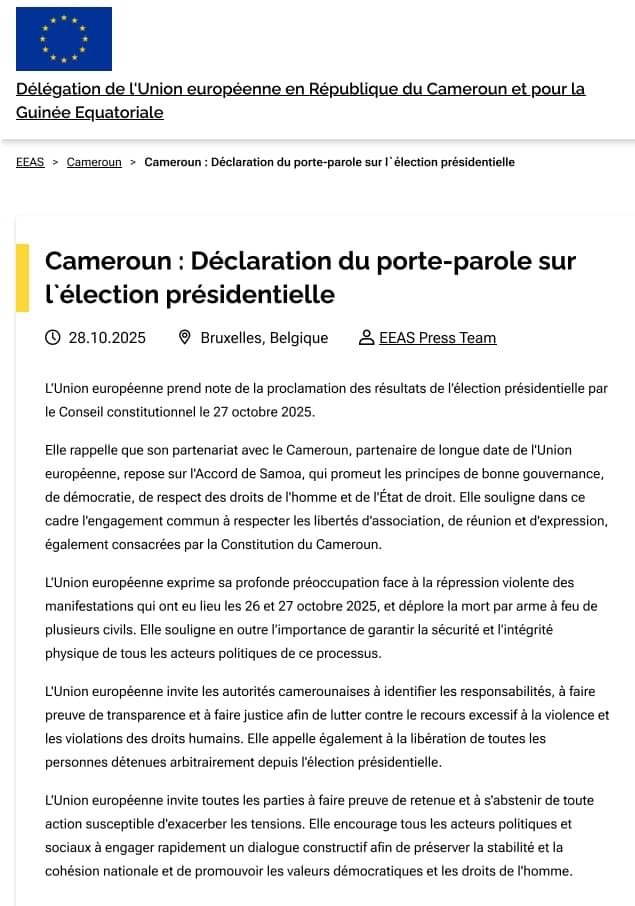 A cet effet, l’Union européenne a exprimé sa profonde préoccupation face à la répression violente des manifestations qui ont eu lieu les 26 et 27 octobre 2025 à savoir la veille et le jour de la proclamation des résultats par le Conseil Constitutionnel qui a déclaré vainqueur le président sortant Paul Biya, 92 ans, 43 ans au pouvoir, appelé à prêter serment dans les prochains jours pour un 8ème mandat consécutif.