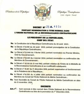Honoré le 13 Novembre dernier par Décret N°25.403 au titre du 1er Décembre 2025, signé par le Président de la République Centrafricaine, Pr Faustin Archange TOUADERA, le journaliste Sylvain YANGMAN SINDJA, en service au poste national de la CRTV, a reçu la médaille de Chevalier dans l’Ordre de la Reconnaissance Centrafricaine.