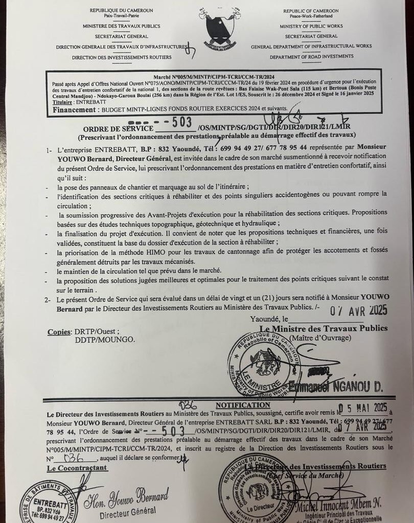 A travers un Ordre de service Notifié le 5 mai 2025 au Directeur Général de l’entreprise ENTREBATT SARL, en charge des travaux d’entretien sur ces deux sections de la Nationale N°1, le Maître d’ouvrage interpelle ainsi l’entreprise sur la nécessité d’adapter ses interventions aux dégradations et à leur traitement en urgence. Aussi, il est prescrit intervention méthodique et graduée, tenant compte du relèvement du niveau de service de ces sections.