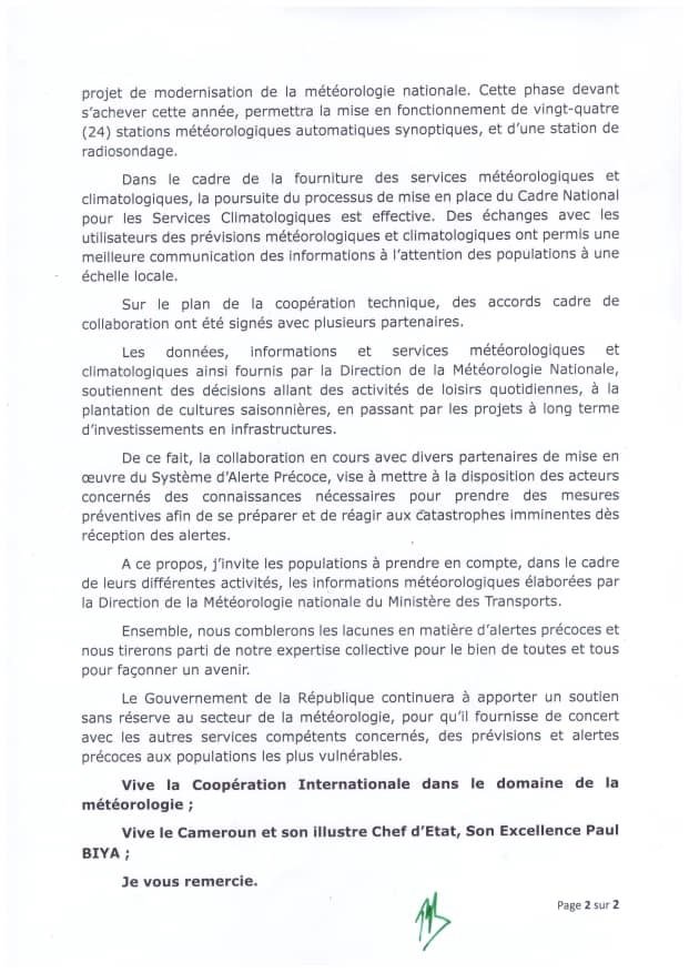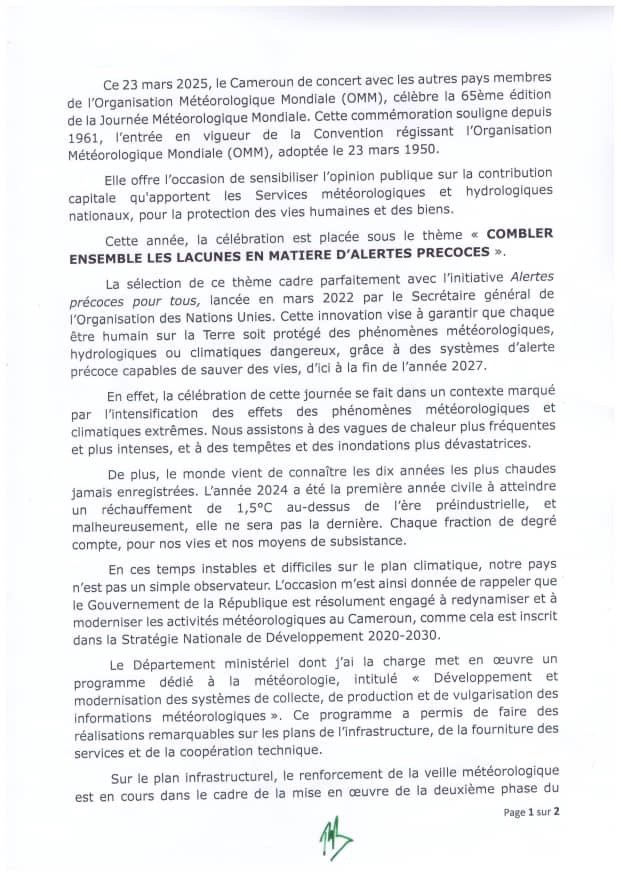 De concert avec la communauté internationale et les pays membres de l’Organisation Météorologique Mondiale (OMM), le Cameroun célèbre ce 23 mars 2025, la 65e édition de la Journée météorologique mondiale. À cet effet, le Ministre des Transports, Jean Ernest Massena NGALLE BIBÉHÈ, a porté un message à l’endroit des populations.