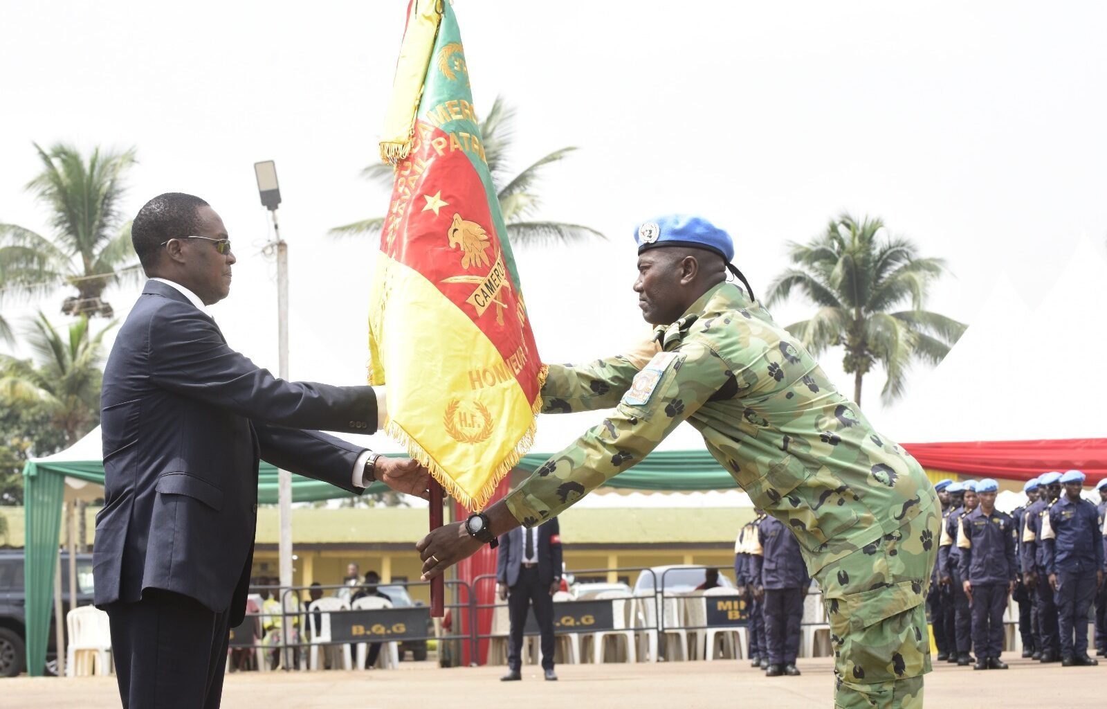 Une cérémonie riche en sons et couleurs au cours de laquelle le membre du gouvernement, au nom du Président de la République, a salué la bravoure de ces vaillants soldats qui ont donné le meilleur d’eux-mêmes en terre Centrafricaine. Une mission qui selon le ministre de la Défense, n’a nullement été un long fleuve tranquille. Le MINDEF a par la suite félicité leur professionnalisme et leur sens élevé du devoir qui a été assuré avec efficacité la sécurisation des zones placées sous leur responsabilité, mené des actions civilo-militaires à fort impact social, et fait la démonstration, en toute circonstance, de la rigueur disciplinaire propre aux Forces de Défense camerounaises. << Mesdames, Messieurs les Casques Bleus de retour de la MINUSCA, votre mission n’a nullement été un long fleuve tranquille. Elle s’est déroulée dans un environnement opérationnel complexe, marqué par des menaces réelles, des conditions de vie rudes et diverses contraintes. Pourtant, face à tous ces périls et dangers, vous êtes demeurés dignes, fidèles à votre serment et résolument loyaux à vos engagements. En un mot, vous avez porté haut les couleurs de la République, consolidant l’image d’un Cameroun crédible, responsable et solidaire des pays frères en difficulté. Au nom du Haut Commandement, je vous adresse les félicitations les plus appuyées du Chef de l’État, Chef des Forces Armées, pour le courage avec lequel vous vous êtes acquittés de votre mandat. Vos prestations ont été unanimement saluées tant par les autorités onusiennes que par les communautés sociales bénéficiaires, qui ont vu en vous des protecteurs dévoués et attentionnés. Au nom du Haut Commandement, nous vous adressons nos félicitations les plus appuyées du Chef de l’État, Chef des Forces Armées, pour le courage avec lequel vous vous êtes acquittés de votre mandat. Depuis 2008, plus de 12 000 militaires et gendarmes camerounais ont servi comme Casques bleus, plaçant notre pays parmi les vingt premiers contributeurs de troupes au monde>>.