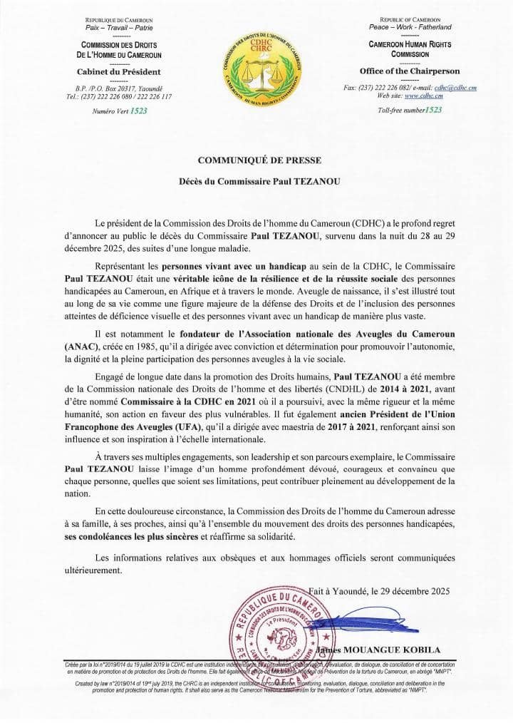 C’est à l’issue d’un communiqué rendu public le 29 décembre 2025 par le Pr James Mouangue Kobila, Président de la Commission des Droits de l’Homme du Cameroun.