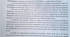 Place ce 24 juillet à une descente du Ministre des Travaux Publics sur le site du SAGO, à l’effet de féliciter le professionnalisme et le dynamisme de son équipe engagée à édifier de manière précise et concise les citoyens et visiteurs venus se ressourcer au MINTP. Après quelques minutes d’échanges avec ses équipes, le Ministre Emmanuel Nganou Djoumessi a achevé sa tournée par la visite des stands des organismes sous tutelle de son département ministériel( Fonds Routier, Labogenie et Matgenie), ainsi que d’autres administrations de l’Etat. Griffé le livre d’Or au cours de son passage n’était pas en reste.