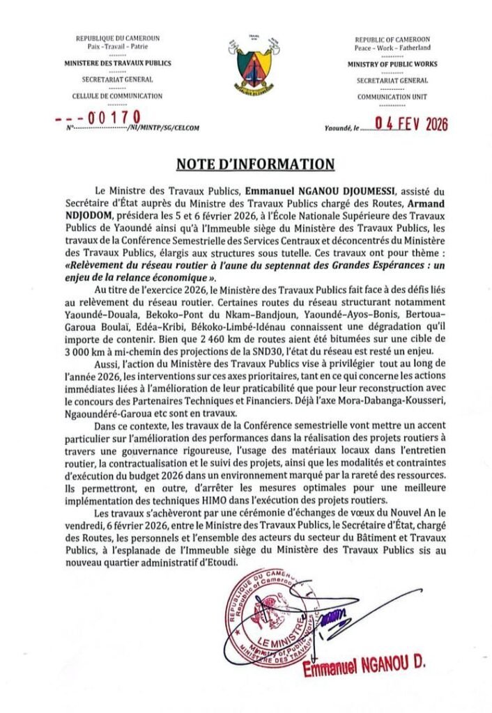 C’est au cours de la conférence semestrielle des services centraux et déconcentrés, élargis aux organismes sous-tutelles du ministère des travaux publics,couplée à la cérémonie de présentation des vœux qui se tiennent du 05 au 06 février 2026 à Yaoundé.